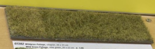 Fogliame del prato: il fogliame del prato è anche creato da floccaggio elettrostatico. In contrasto con il Wild Grass Foliage, vengono utilizzate fibre di erba più corte. Il prato è utilizzato in tutte le aree, come ad esempio prati, pascoli e terreni agricoli.